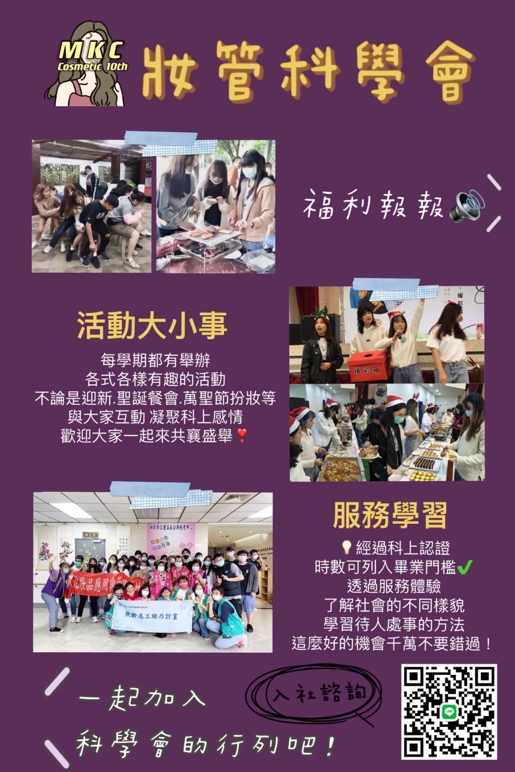 妝管科會主要舉辦各類別的活動,像是有關於畢業門檻的服務學習,或是迎新、送舊、聖誕餐會還有許多等等的小活動,來促進妝管科大家庭的感情,歡迎大家一起加入妝管科學會,來跟我們一起創造美好的回憶吧!